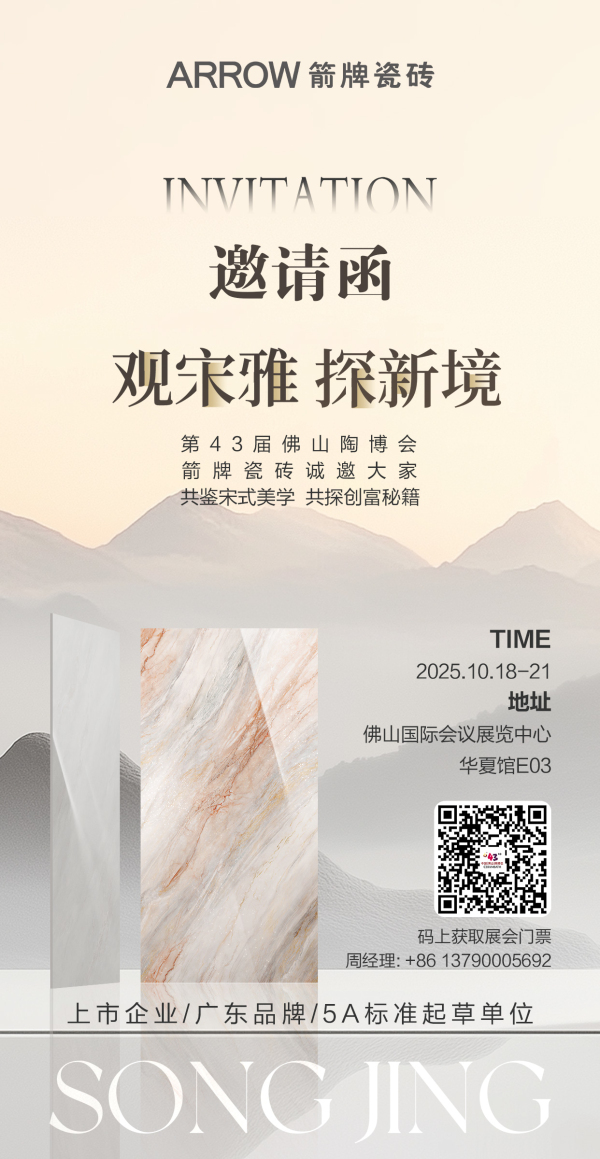10月18日-10月21日,誠邀您蒞臨佛山國際會議展覽中心華夏館E03展位,近距離感受箭牌瓷磚的產品魅力與品牌實力,探索人居空間美學的無限可能!
