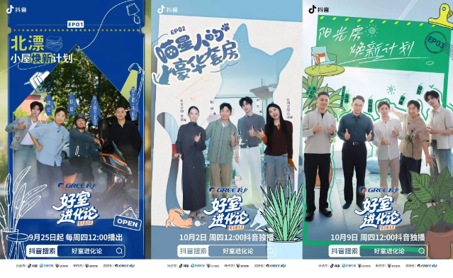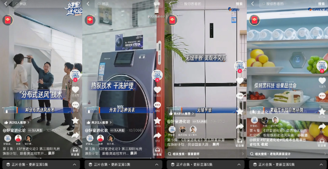 為打通 “觀看—種草—消費” 的關鍵鏈路,「好室進化論」IP特別打造H5專題頁面,最大化承接全站熱度,將內容價值高效轉化為商業價值。專題頁作為微綜播放入口,支持用戶隨時回看節目精彩片段;同時整合達人種草專區,集中展示格力產品在真實場景中的使用效果;最后設置 “同款選購” 通道,用戶可直接跳轉購買微綜中出現的新國標全能王空調、505荔枝冰箱、鯨濤鋅礦凈水機等產品。另外,節目依托抖音平臺強大的流量資源,通過話題頁、開屏廣告、阿拉丁推薦、H5等多渠道全方位導流,最大化覆蓋目標受眾。
