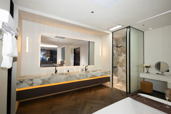 項目主材:石晶地板(黑曜月紋-人字拼)、石晶墻板(莎安娜洞石)、雪晶墻板(子午灰)