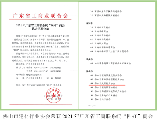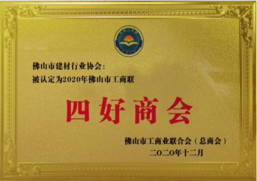 佛山市建材行業協會得到了佛山市工商聯的關懷和指導,按照“四好商會”的要求規范辦會,做到“政治引領好、隊伍建設好、服務發展好、自律規范好”。為此,協會榮獲“2020年佛山市工商聯‘四好商會’”稱號、榮獲“2021年廣東省工商聯系統‘四好’商會”的稱號。